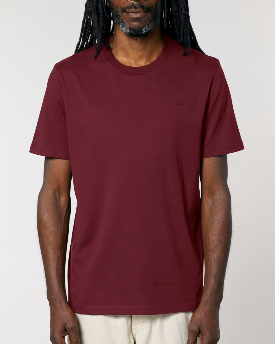 The Slave t-shirt approaches the word with weight and care. Embroidered subtly in colour-matched thread, it keeps the design measured and considered.